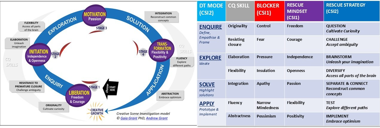 The seven CQ skills can be integrated into the broader Creative Scene Investigation framework through the CSI table, which connects each skill to one of the seven “Suspects” and aligns them with the mode generic Design Thinking tools (divided into 7 strategies). This matrix mapping creates a cohesive, big-picture methodology that links creative capability to root-cause analysis and practical problem-solving.
